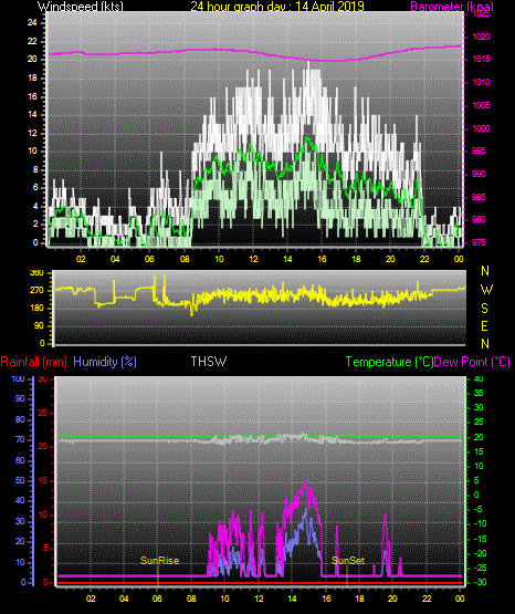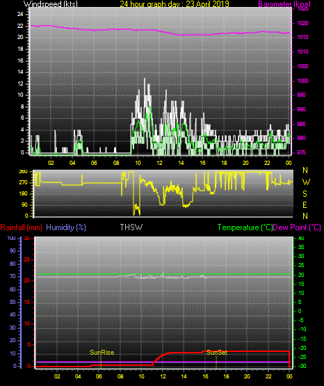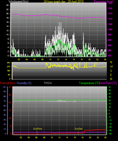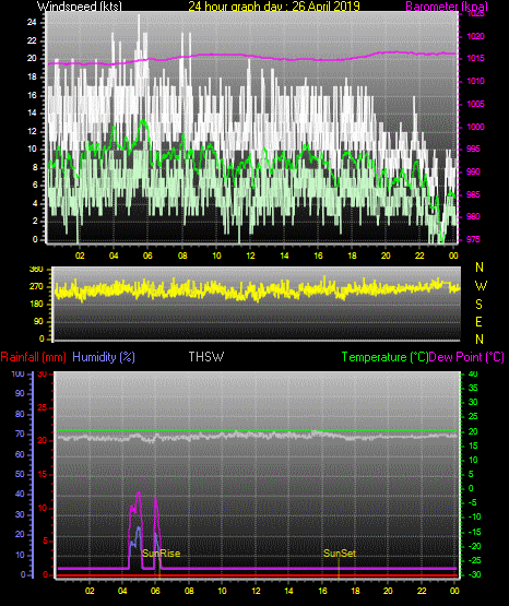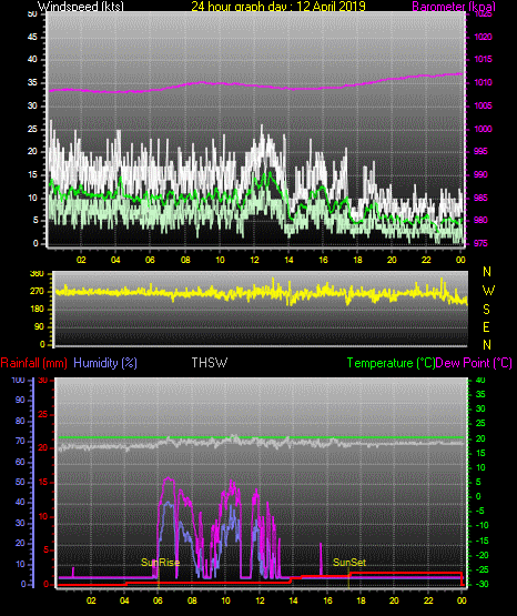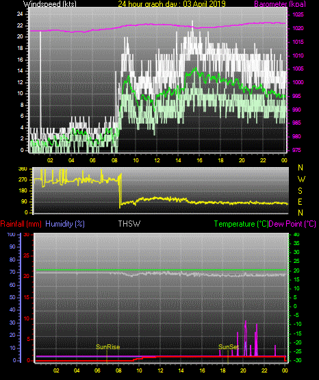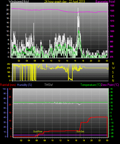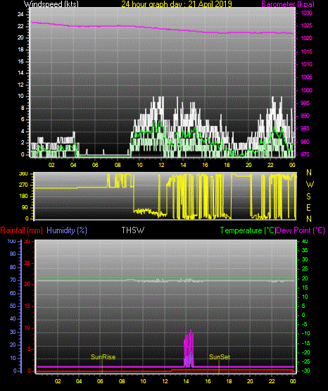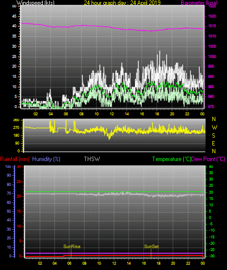 Maximum windspeed = 21.0 kts from 226°( SW) on day 25 at time 22:04
