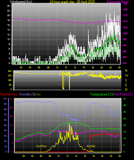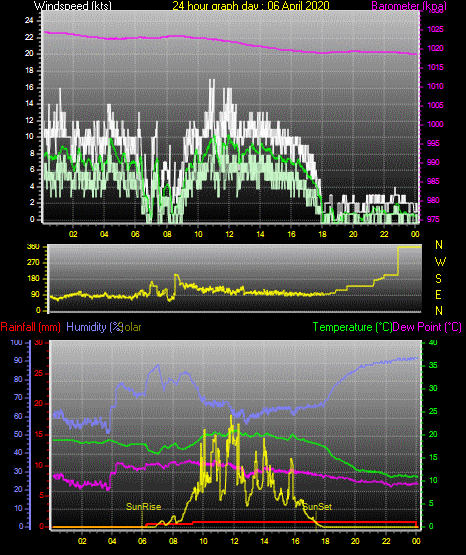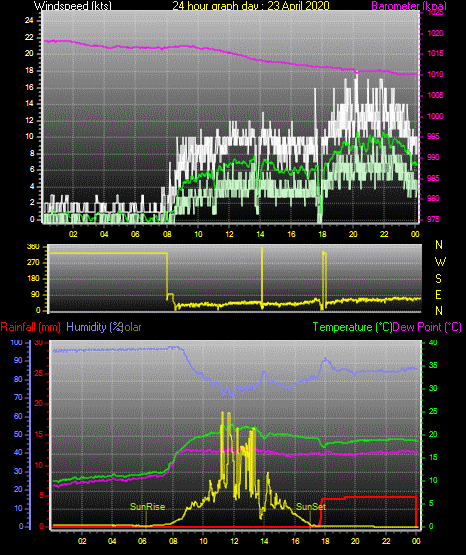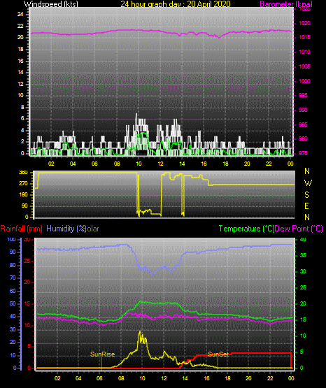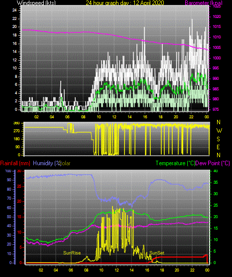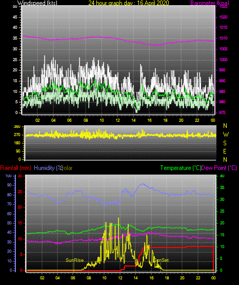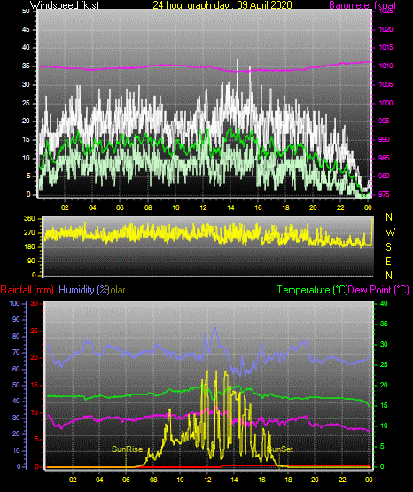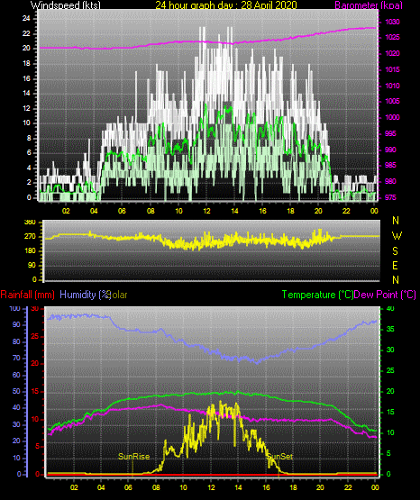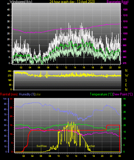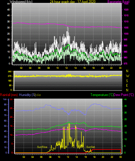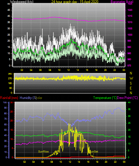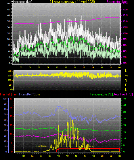 Maximum gust speed = 40.0 kts from 293°(WNW) on day 14 at time 15:28