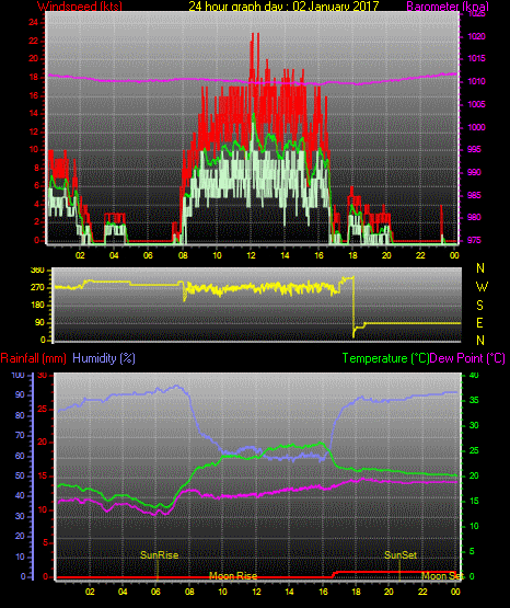 Maximum windspeed = 17.0 kts from 273 °( W ) on day 02 at time 12:08
