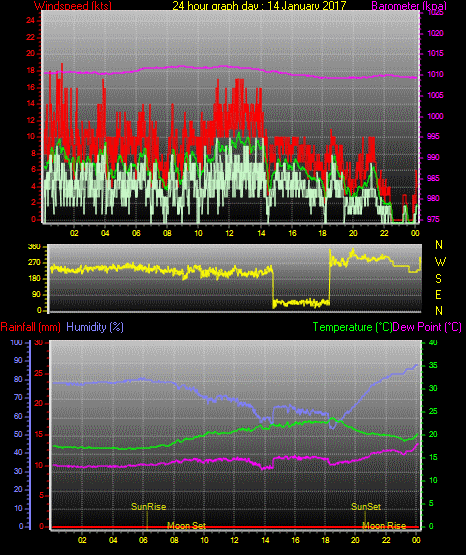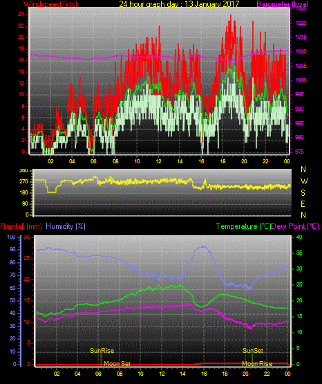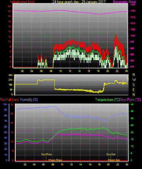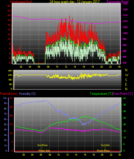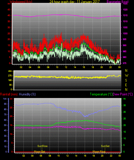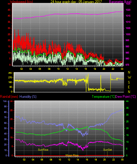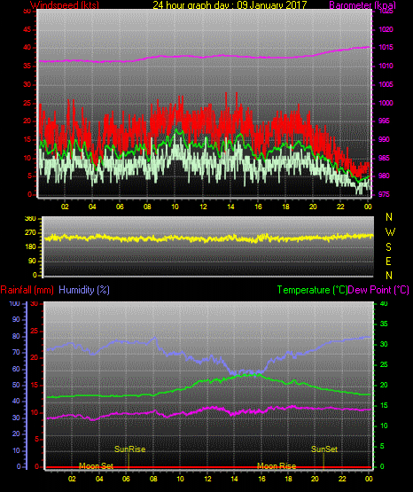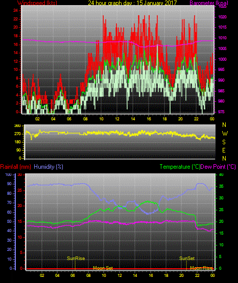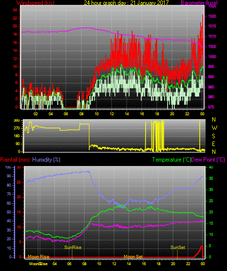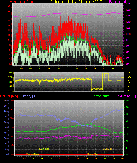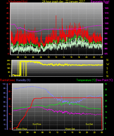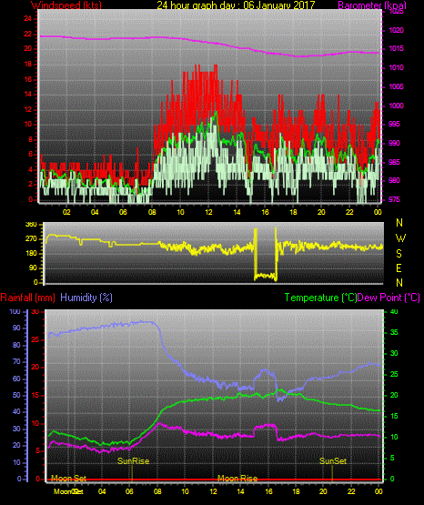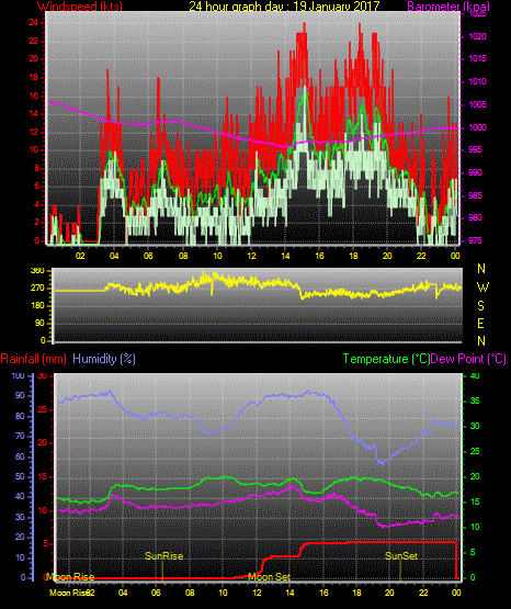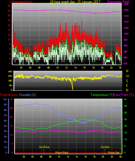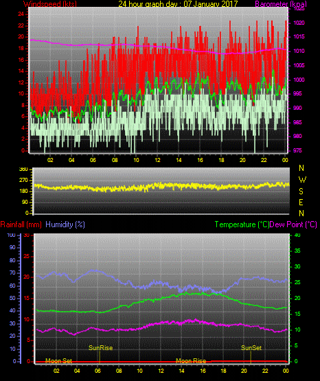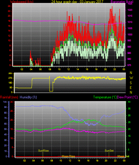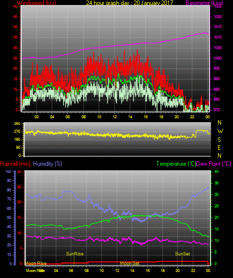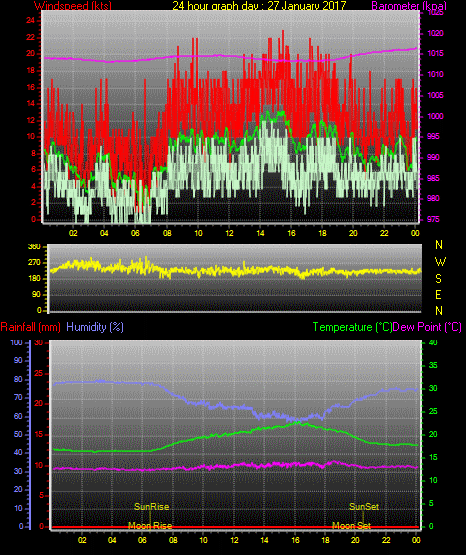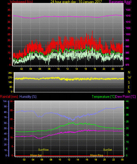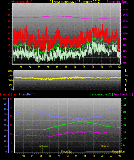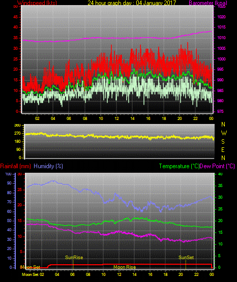 Maximum windspeed = 17.0 kts from 252 °(WSW) on day 03 at time 21:16