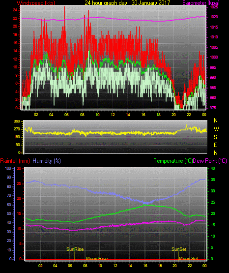 Maximum windspeed = 20.0 kts from 215 °( SW) on day 30 at time 08:53
