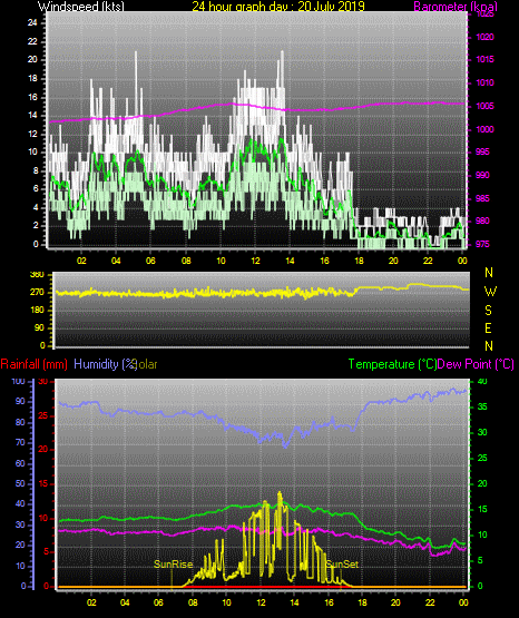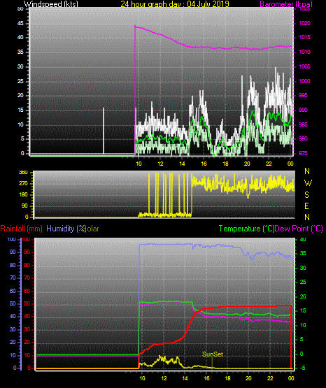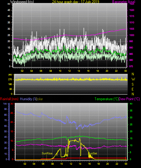 Maximum windspeed = 17.0 kts from 219 °( SW) on day 04 at time 00:33