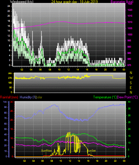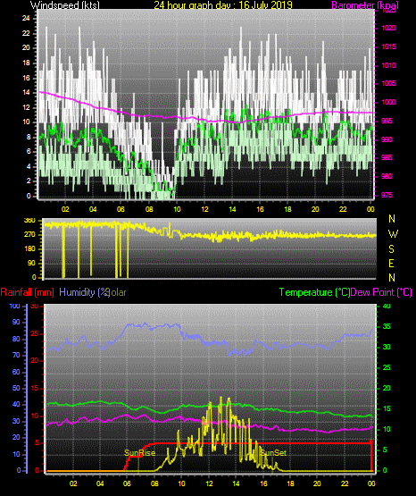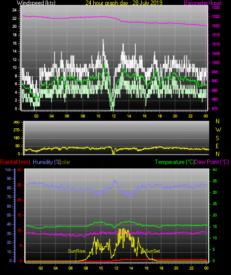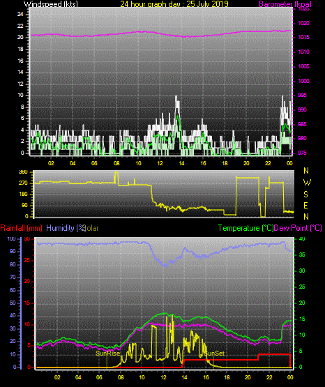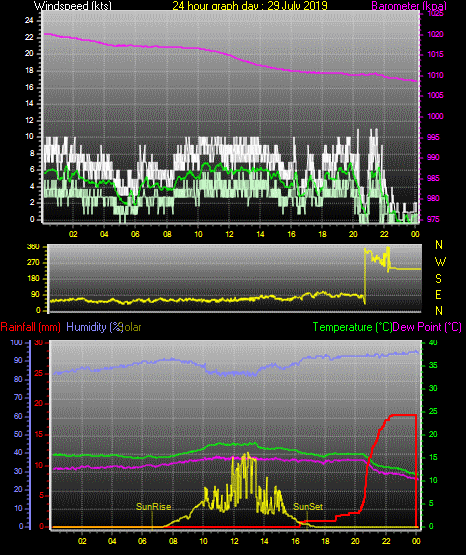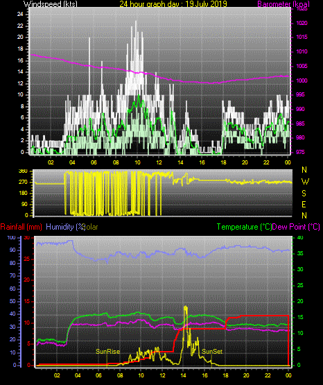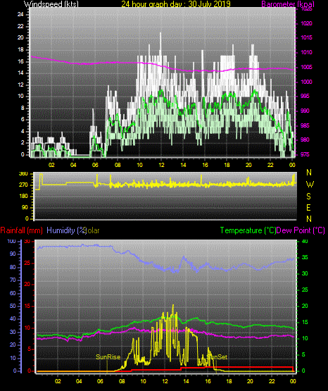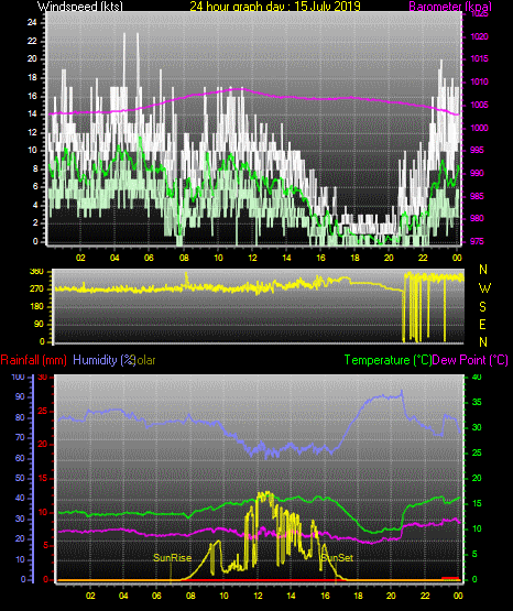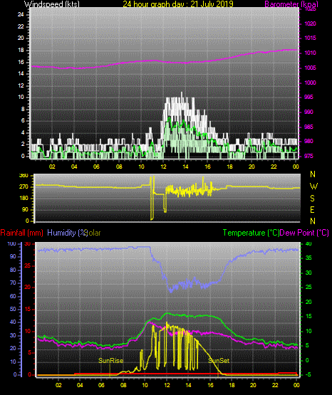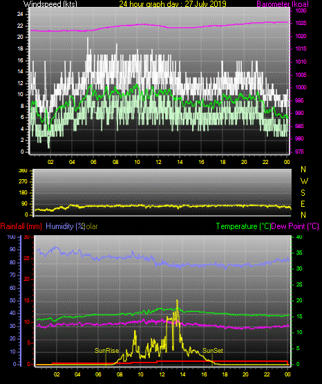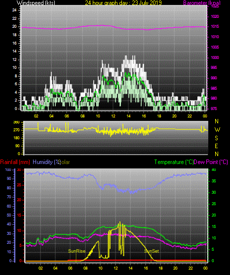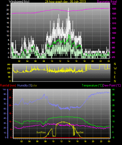 Maximum gust speed = 23 kts from 225°( SW) on day 06 at time 14:07