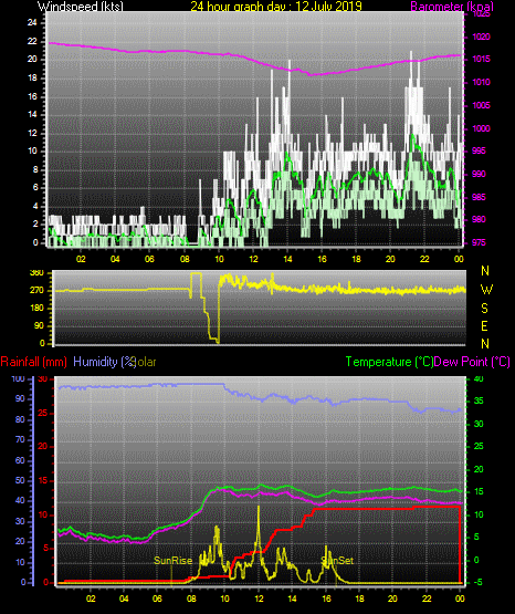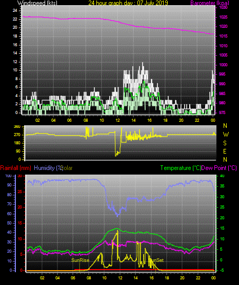Maximum gust speed = 12 kts from 233°( SW) on day 07 at time 15:11