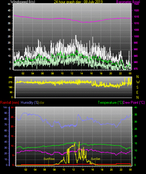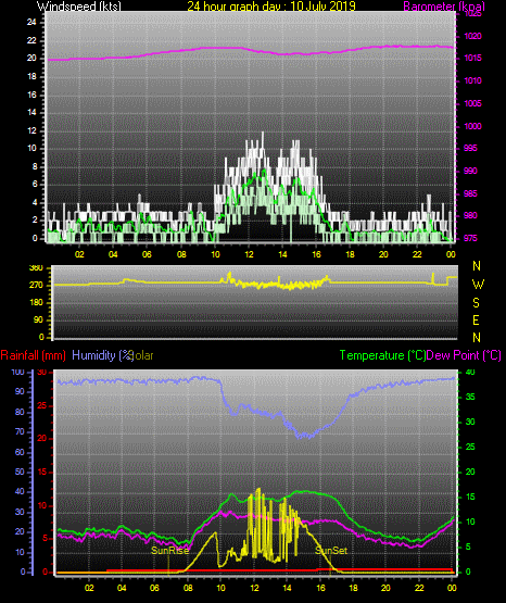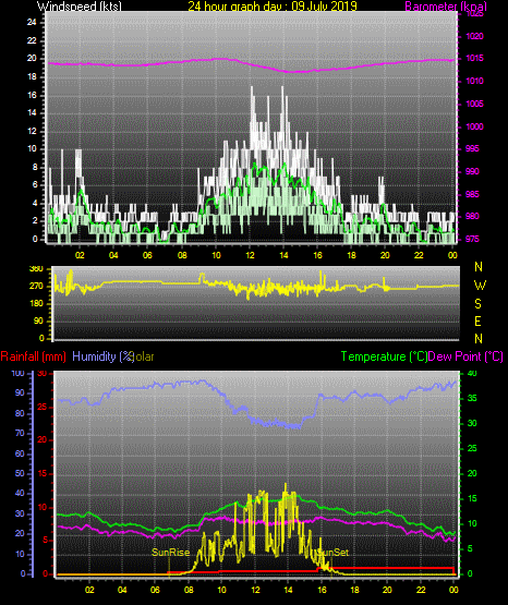Maximum windspeed = 9.0 kts from 248 °(WSW) on day 07 at time 15:15