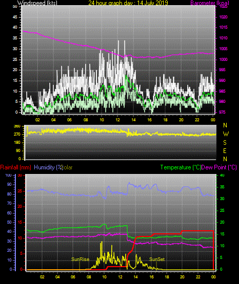 Maximum gust speed = 34.0 kts from 248°(WSW) on day 14 at time 12:57