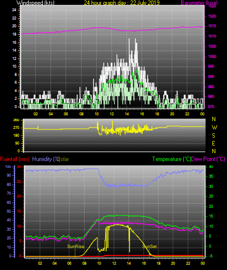 Maximum windspeed = 13.0 kts from 257 °(WSW) on day 06 at time 14:21