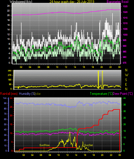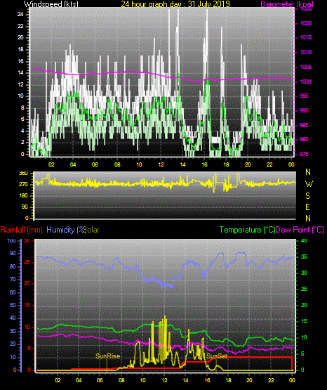 Maximum gust speed = 25 kts from 246°(WSW) on day 31 at time 16:17