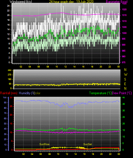 Maximum gust speed = 19 kts from 360°( N ) on day 18 at time 21:53