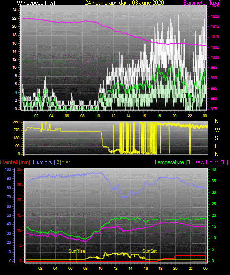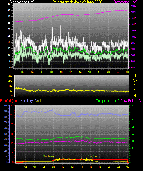Maximum windspeed = 22.0 kts from 360 °( N ) on day 02 at time 06:27