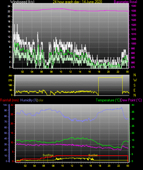 Maximum windspeed = 14.0 kts from 309 °( NW) on day 03 at time 20:34