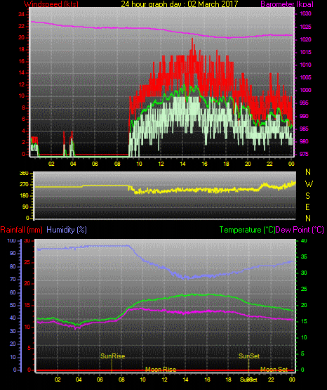 Maximum windspeed = 15.0 kts from 202 °(SSW) on day 02 at time 14:45