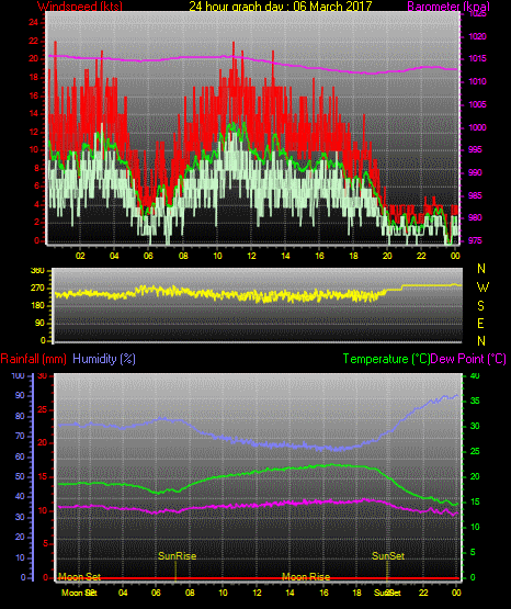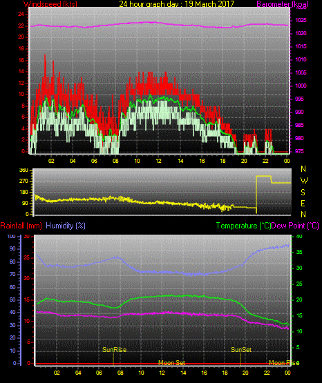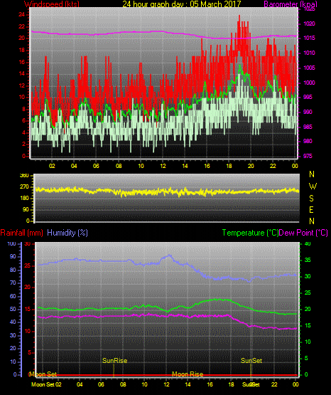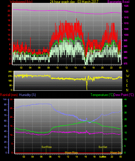 Maximum gust speed = 19 kts from 230°( SW) on day 03 at time 14:17
