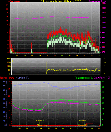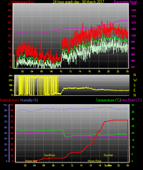 Maximum windspeed = 28.0 kts from 105°(ESE) on day 08 at time 19:08