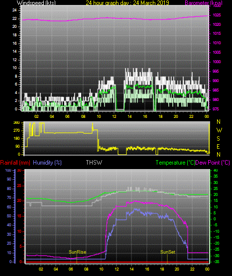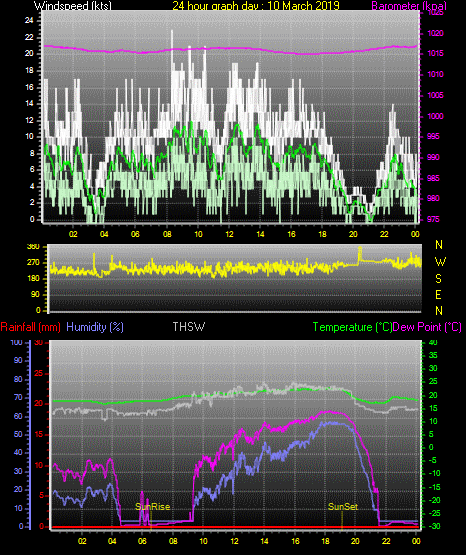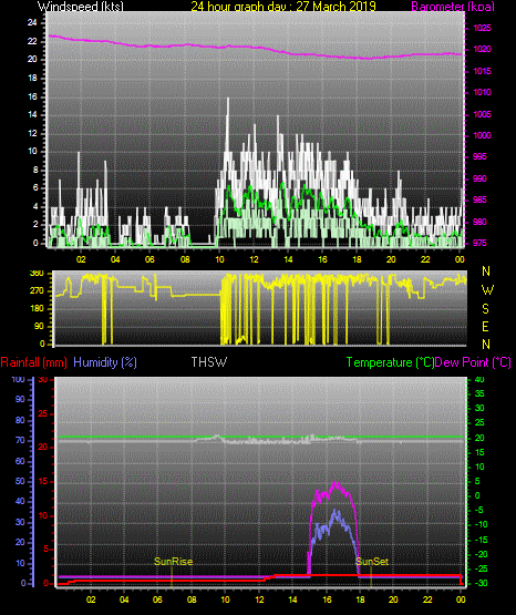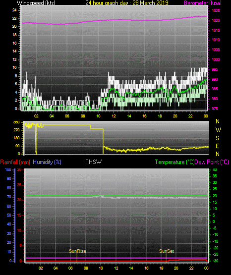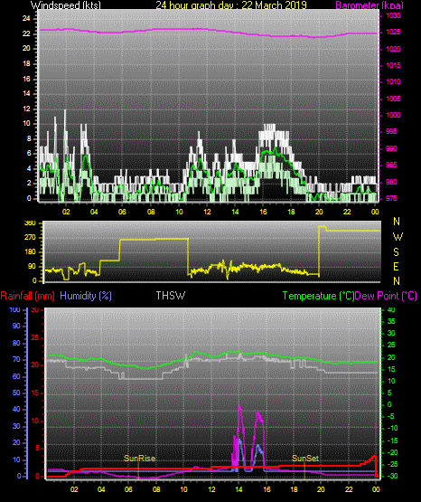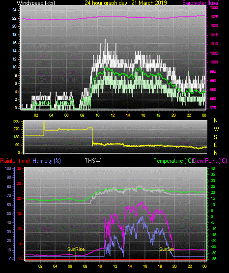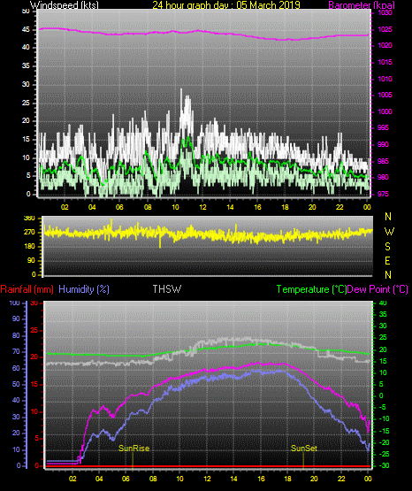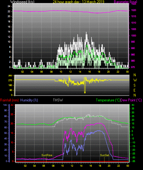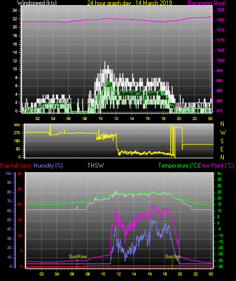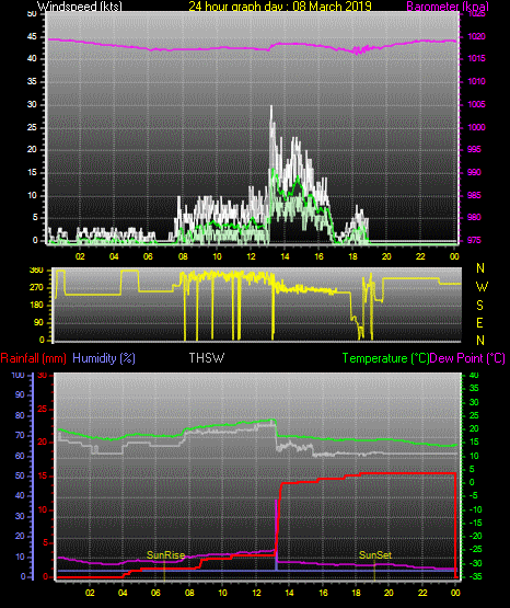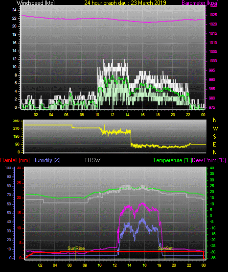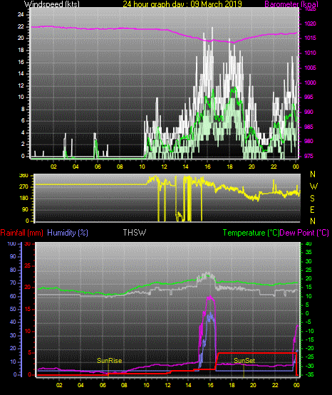 Maximum windspeed = 23.0 kts from 229°( SW) on day 08 at time 13:15