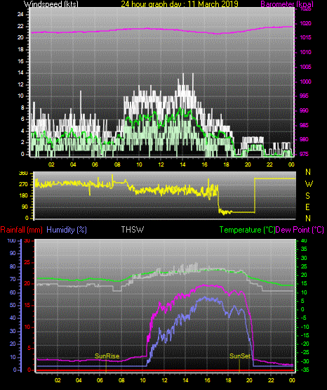 Maximum windspeed = 11.0 kts from 223 °( SW) on day 03 at time 14:07
