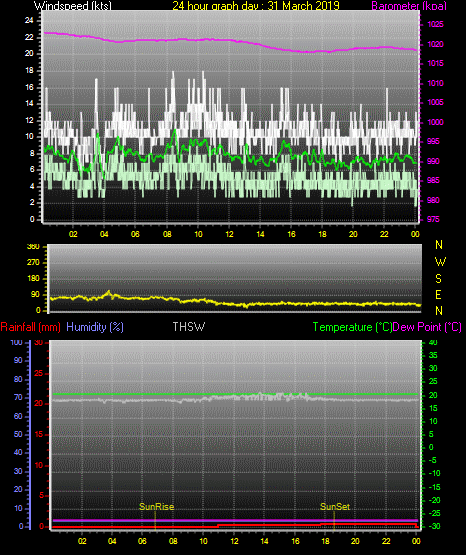 Maximum gust speed = 18 kts from 066°(ENE) on day 31 at time 10:22
