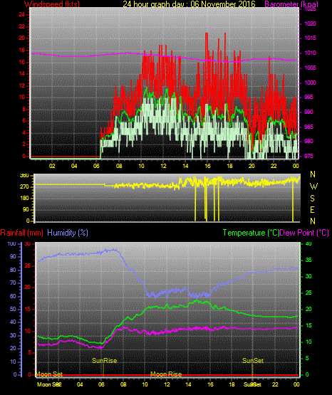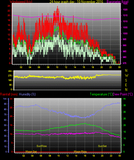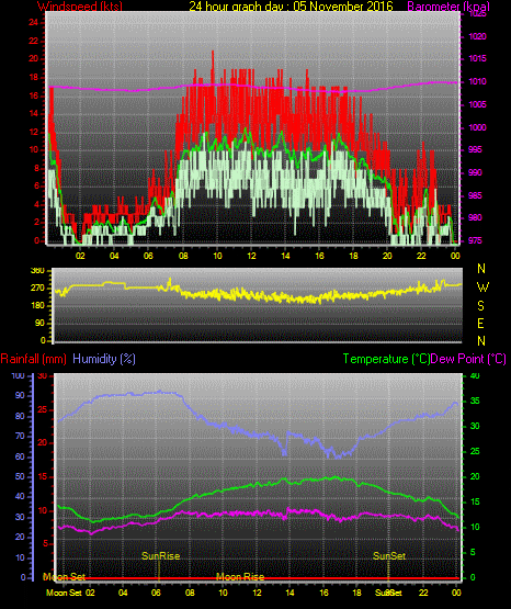 Maximum windspeed = 17.0 kts from 240 °(WSW) on day 02 at time 12:23