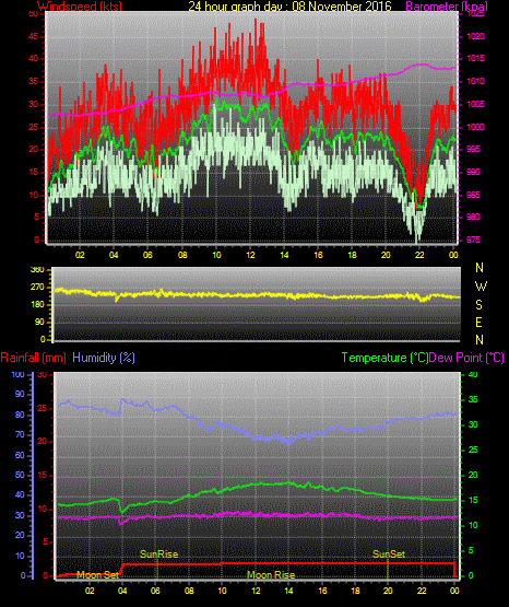 Maximum windspeed = 35.0 kts from 253°(WSW) on day 08 at time 09:55