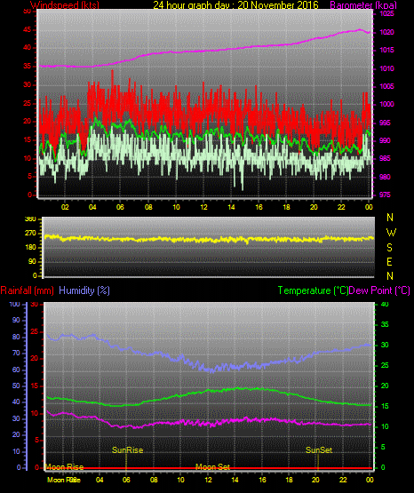 Maximum windspeed = 20.0 kts from 246 °(WSW) on day 29 at time 11:45