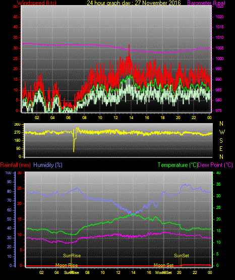 Maximum gust speed = 27 kts from 241°(WSW) on day 29 at time 13:21