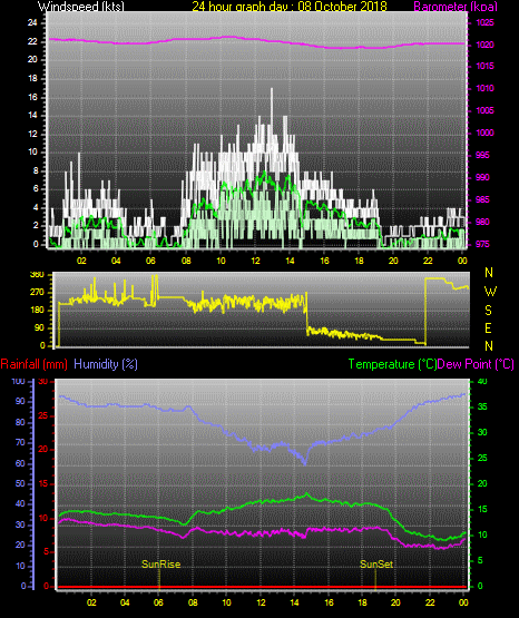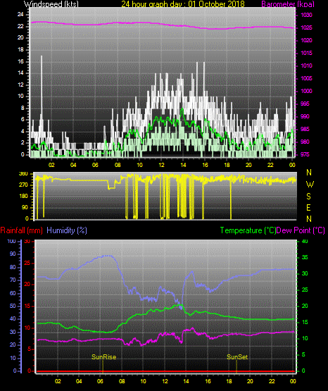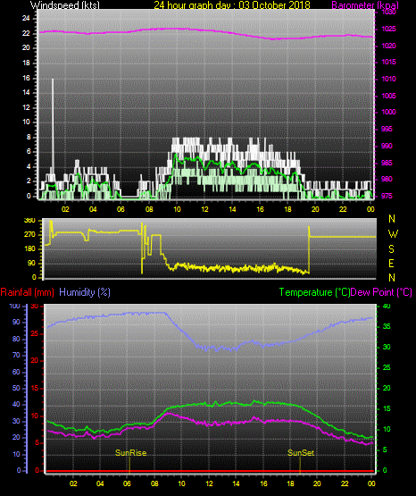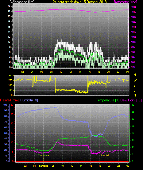 Maximum windspeed = 15.0 kts from 225 °( SW) on day 31 at time 03:33