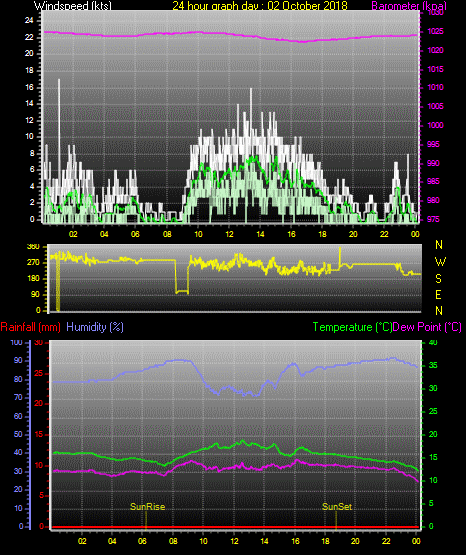 Maximum gust speed = 17 kts from 285°(WNW) on day 02 at time 01:06
