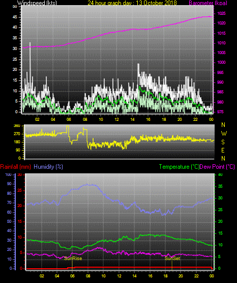 Maximum gust speed = 33.0 kts from 270°( W ) on day 13 at time 01:06