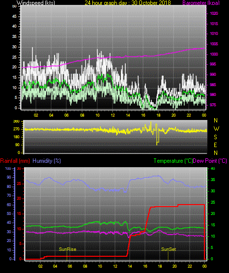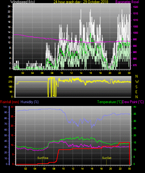 Maximum gust speed = 23 kts from 252°(WSW) on day 29 at time 22:32