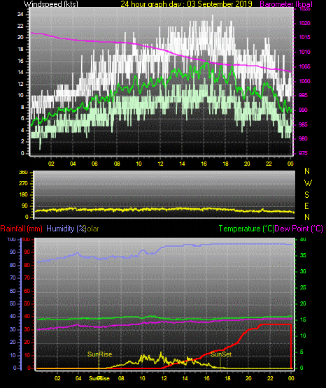 Maximum windspeed = 19.0 kts from 073 °(ENE) on day 03 at time 16:07