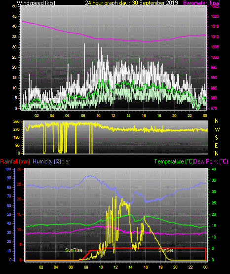 Maximum windspeed = 19.0 kts from 05 °( N ) on day 30 at time 10:29